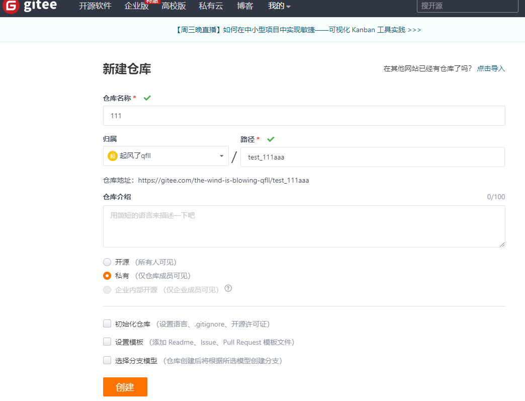 创建好之后会生成一个仓库地址例如下图中地址:https://gitee.com/the-wind-is-blowing-qfll/test_111aaa