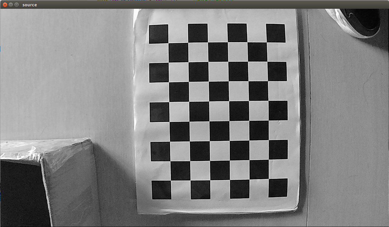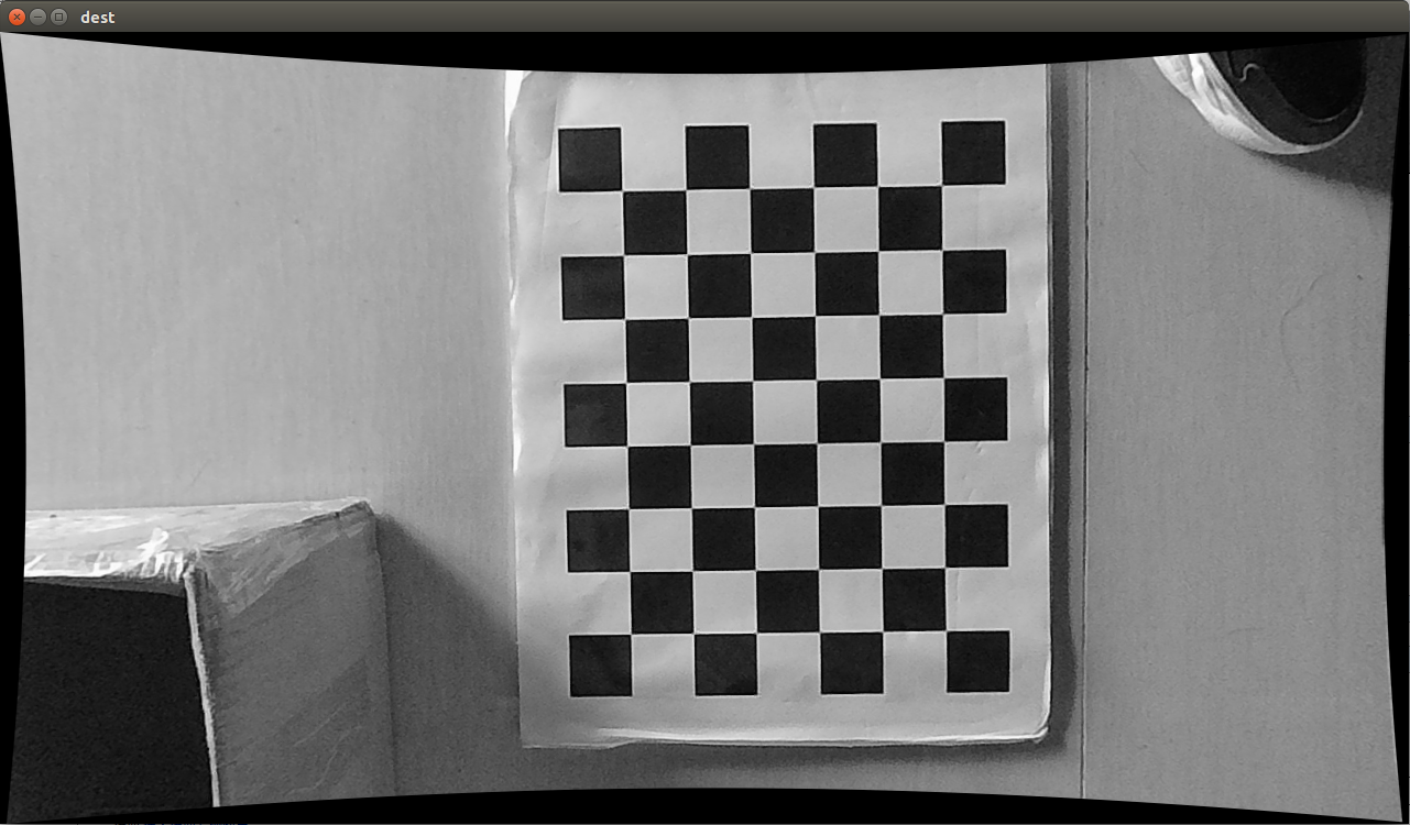 1 void GenerateUndistortImg(Mat img) 2 { 3 Mat mCameraMatrix; //相机内参矩阵 4 Mat mDistcoeffs; //相机畸变系数 5 mCameraMatrix = (Mat_<double>(3,3)<<1394.150188318831, 0, 643.4771005222109, 0, 1395.603286615578, 379.8384205833741, 0, 0, 1); 6 mDistcoeffs = (Mat_<double>(1,5)<<-0.4556144160999324, 0.4050805253333984, 0.001029998925260306, 0.0007947011845121512, -0.2495583894250177); 7 Mat mMap1,Map2; 8 cvtColor(img, img,COLOR_RGB2GRAY); 9 initUndistortRectifyMap(mCameraMatrix,mDistcoeffs,Mat(), 10 getOptimalNewCameraMatrix(mCameraMatrix,mDistcoeffs,img.size(),1,img.size(),0), 11 img.size(),CV_8UC1,mMap1,Map2); 12 imshow("source",img); 13 remap(img, img, mMap1, Map2, INTER_LINEAR); 14 imshow("dest",img); 15 }