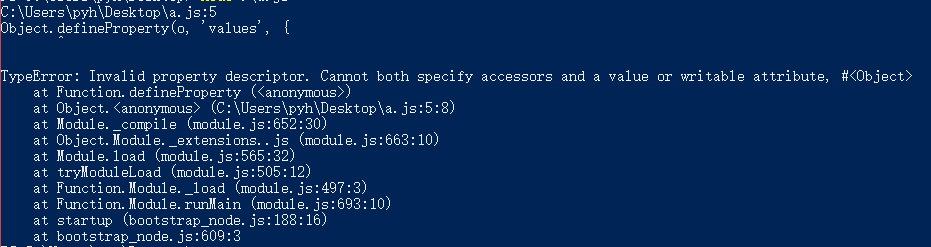 如果一个描述符不具有value、writable、get和set任意一个关键字,那么它将被认为是一个数据描述符。如果同时具有value或writable和get或set关键字,将会产生异常