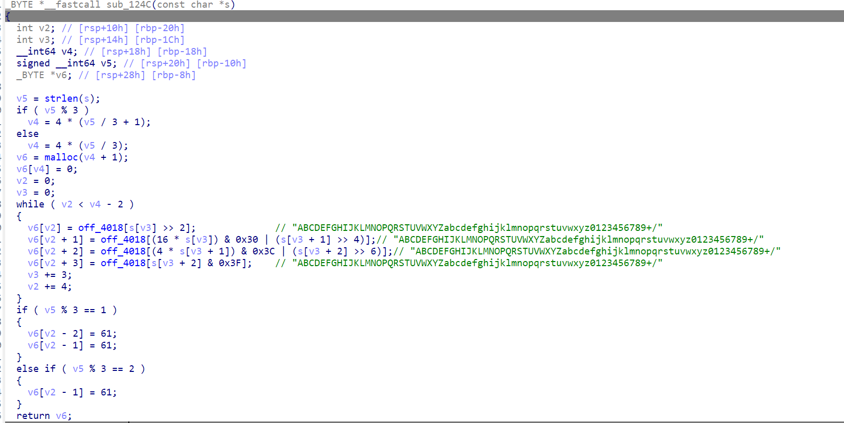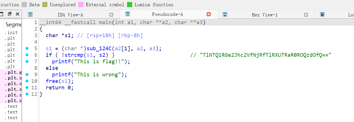 并且可以直接看到密文"TlNTQ1RGe2Jhc2VfNjRfTlRXUTRaR0ROQzdOfQ==",可以看出是base64加密(长度为4的倍数,不足的用“=”代替),此时就需要看加密逻辑,注意到上面与s1有关的函数是sub_124C,双击进入函数。