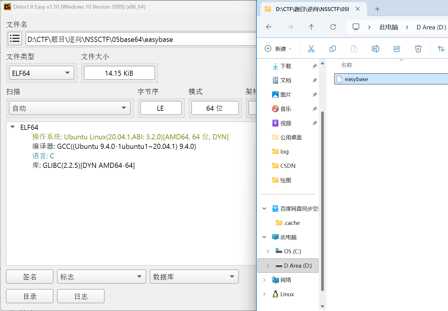 观察到文件没有后缀,拖入DIE中发现文件操作系统为Ubuntu Linux,C语言,无壳。而且文件名为easybase,因此推断是base系列加密。
