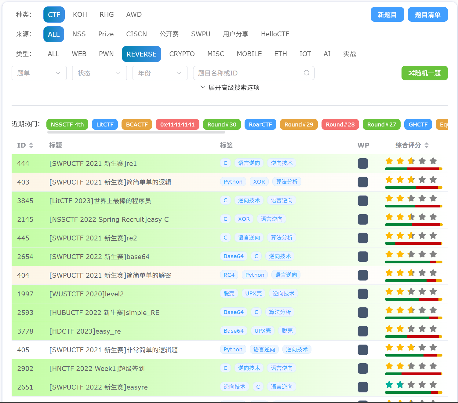 这里推荐一些可以训练的平台(参考自快速开始 - Hello CTF)。个人最常用的是第一个平台NSSCTF,因为其丰富的筛选机制和简洁明了的题目类型,能让你快速掌握某一类题目。当你完成特定标签的题目并进行分类研究复盘时,这类题目的解题能力将显著提升。建议初学者优先选择已掌握编程语言的题目进行练习。