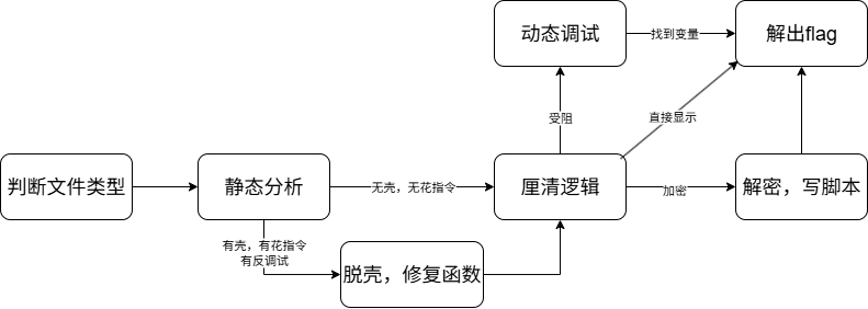 - 初步分析:判断文件是否被保护(加壳、花指令、反调试),从而规划后续处理路径。