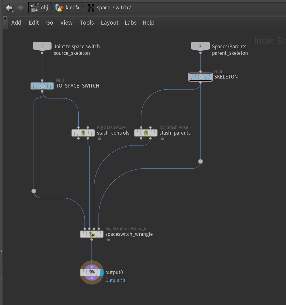 #include <kinefx.h> #include <kinefx_posedifference.h> // Get joint data string joint_name = chs("../joint") ; string split[] = split(joint_name, "="); if(len(split) > 1) joint_name = split[1] ; int joint_id = findattribval(0, "point", "name", joint_name); matrix joint_move_M = pointtransform(0, joint_id) ; matrix joint_stash_M = pointtransform(1, joint_id) ; // Get space swtich int chosen_space = chi("../spaceswitch") ; // Transformation compoments used for blend int components = chi("../components") ; // Prep variables string parent_parm ; string parent_name ; int parent_id ; if(chosen_space >= 0 && chosen_space < chi("../config")) { int i = chosen_space + 1 ; // Get parent data parent_parm = sprintf("../parent%d", i); parent_name = chs(parent_parm) ; split = split(parent_name, "=") ; if(len(split) > 1) parent_name = split[1] ; parent_id = findattribval(2, "point", "name", parent_name); matrix parent_stash_M = pointtransform(2, parent_id) ; matrix parent_move_M = pointtransform(3, parent_id) ; // Get diference matrix matrix diff_M = joint_stash_M * invert(parent_stash_M) ; // Finall matrix matrix end_M = diff_M * parent_move_M ; // Blend with input 0 matrix blend_M = blendtransforms(joint_move_M, end_M, 1.0, components) ; setpointtransform(0, joint_id, blend_M,1); }