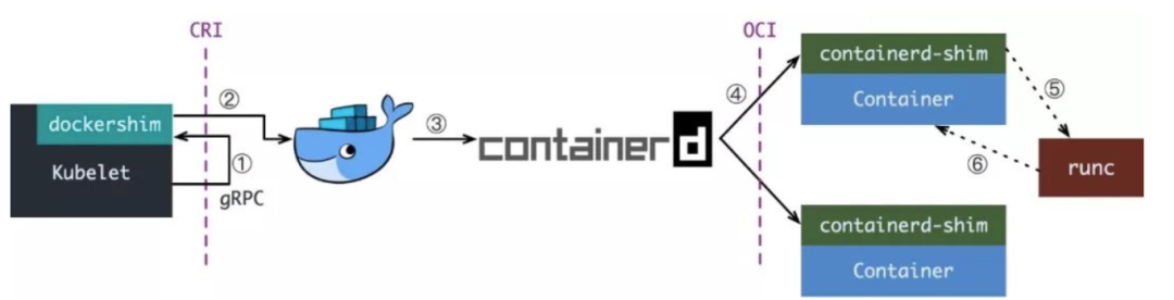 - 1、Kubelet 通过 CRI 接口(gRPC)调用 dockershim,请求创建一个容器。CRI 即容器运行时接口,这一步中,Kubelet 可以视作一个简单的 CRI Client,而 dockershim 就是接收请求的 Server。目前 dockershim 的代码其实是内嵌在 Kubelet 中的,所以接收调用就是 Kubelet 进程。