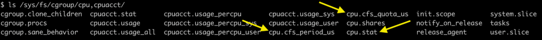 cgroup 的所有 CPU 指标都位于/sys/fs/cgroup/cpu,cpuacct/<container>. 配额和期间设置位于cpu.cfs_quota_us和中cpu.cfs_period_us。