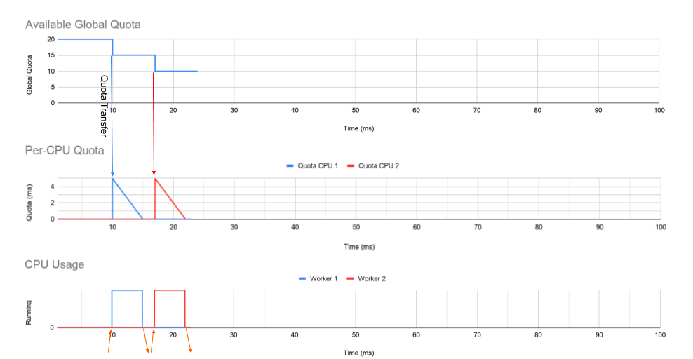 这里有一个多线程守护进程的例子,它有两个工作线程,每个工作线程都固定在自己的核心上。如下图,第一个图显示了 cgroup 在一段时间内的全局配额。这从 20ms 的配额开始,这与 0.2 CPU 相关。中间的图表显示分配给每个 CPU 队列的配额,底部的图表显示实际工作线程在其 CPU 上运行的时间。