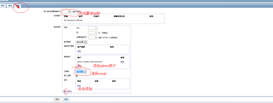 Operations选项卡中,new添加,User中添加Admin,Send only to=Email,Save。
