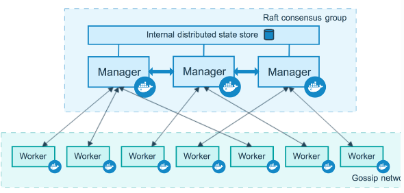 当部署应用到集群,你将会提交服务定义到管理节点,接着Manager管理节点调度任务到worker节点,manager节点还执行维护集群的状态的编排和群集管理功能,worker节点接收并执行来自manager节点的任务。通常,manager节点也可以是worker节点,worker节点会报告当前状态给manager节点