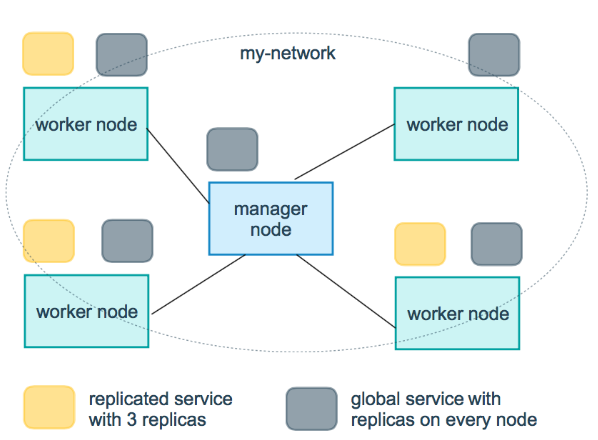 任务是在docker容器中执行的命令,Manager节点根据指定数量的任务副本分配任务给worker节点