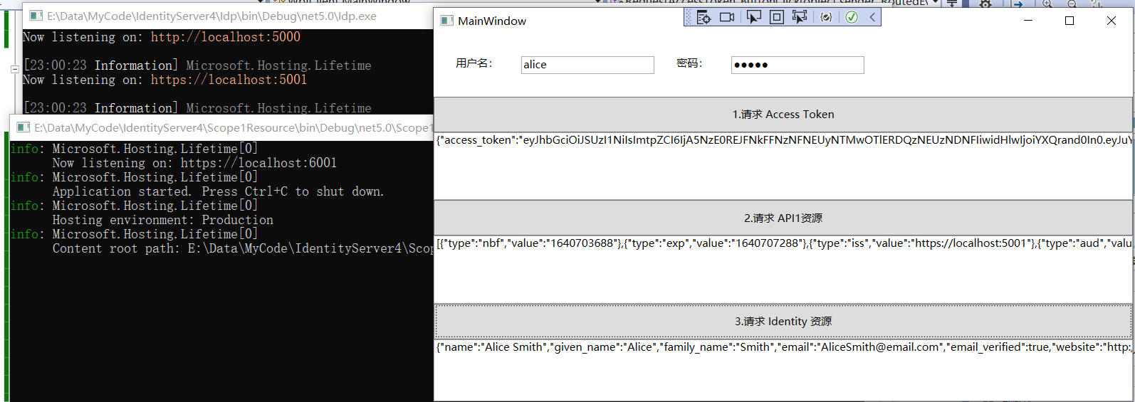 <Window x:Class="WpfClient.MainWindow" xmlns="http://schemas.microsoft.com/winfx/2006/xaml/presentation" xmlns:x="http://schemas.microsoft.com/winfx/2006/xaml" xmlns:d="http://schemas.microsoft.com/expression/blend/2008" xmlns:mc="http://schemas.openxmlformats.org/markup-compatibility/2006" xmlns:local="clr-namespace:WpfClient" mc:Ignorable="d" Title="MainWindow" Height="450" Width="800"> <Grid> <Grid.RowDefinitions> <RowDefinition Height="70" /> <RowDefinition Height="40" /> <RowDefinition /> <RowDefinition Height="40" /> <RowDefinition /> <RowDefinition Height="40" /> <RowDefinition Height="70" /> </Grid.RowDefinitions> <StackPanel Grid.Row="0" Margin="20" Orientation="Horizontal"> <Label>用户名:</Label> <TextBox x:Name="UserNameInput" Margin="20 0" Width="150" Height="20">alice</TextBox> <Label>密码:</Label> <PasswordBox x:Name="PasswordInput" Margin="20 0" Width="150" Height="20" Password="alice"></PasswordBox> </StackPanel> <Button Grid.Row="1" Click="RequestAccessToken_ButtonClick"> 1.请求 Access Token </Button> <TextBox Grid.Row="2" x:Name="AccessTokenTextBlock" VerticalAlignment="Stretch" HorizontalAlignment="Stretch" IsReadOnly="True" AcceptsReturn="True" AcceptsTab="True"> </TextBox> <Button Grid.Row="3" Click="RequestScope1Resource_ButtonClick">2.请求 API1资源</Button> <TextBox Grid.Row="4" x:Name="Scope1ResponseTextBlock" VerticalAlignment="Stretch" HorizontalAlignment="Stretch" IsReadOnly="True" AcceptsReturn="True" AcceptsTab="True"> </TextBox> <Button Grid.Row="5" Click="RequestIdentityResource_ButtonClick">3.请求 Identity 资源</Button> <TextBox Grid.Row="6" x:Name="IdentityResponseTextBlock" VerticalAlignment="Stretch" HorizontalAlignment="Stretch" IsReadOnly="True" AcceptsReturn="True" AcceptsTab="True"> </TextBox> </Grid> </Window>
