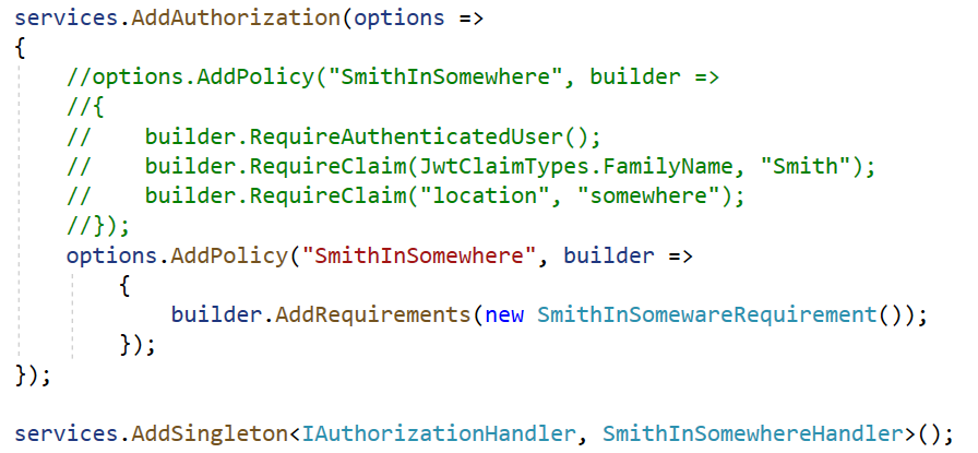 public class SmithInSomewareRequirement : IAuthorizationRequirement { public SmithInSomewareRequirement() { } } public class SmithInSomewhereHandler : AuthorizationHandler<SmithInSomewareRequirement> { protected override Task HandleRequirementAsync(AuthorizationHandlerContext context, SmithInSomewareRequirement requirement) { //var filterContext = context.Resource as AuthorizationFilterContext; //if (filterContext == null) //{ // context.Fail(); // return Task.CompletedTask; //} var familyName = context.User.Claims.FirstOrDefault(c => c.Type == JwtClaimTypes.FamilyName)?.Value; var location = context.User.Claims.FirstOrDefault(c => c.Type == "location")?.Value; if (familyName == "Smith" && location == "somewhere" && context.User.Identity.IsAuthenticated) { context.Succeed(requirement); return Task.CompletedTask; } context.Fail(); return Task.CompletedTask; // 一个Handler成功,其它的Handler没有失败 => Requirement被满足了 // 某个Hanlder失败 => 无法满足Requirement // 没有成功和失败 => 无法满足Requirement } }