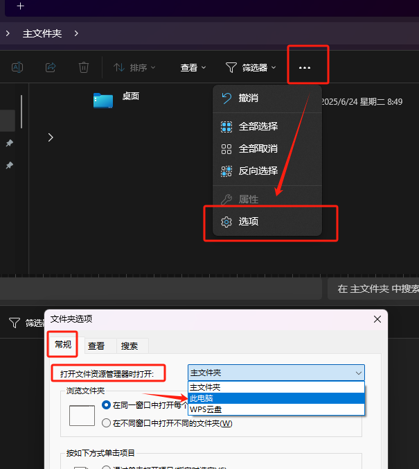 - win+E 打开窗口 右边三个点 下拉 选项