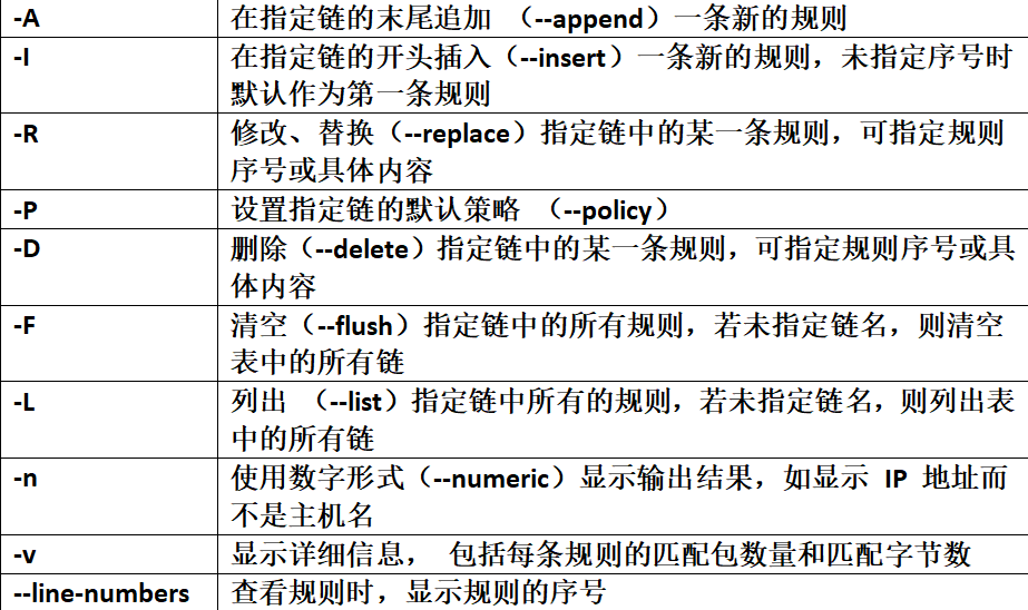 iptables [-t 表名] -n -L [链名] [--line-numbers] 或 iptables - [vn] L