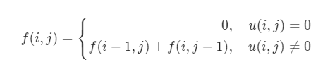 **1. **我们用 f(i, j)来表示从坐标 (0, 0) 到坐标 (i,j) 的路径总数,u(i,j) 表示坐标 (i,j) 是否可行,如果坐标 (i,j) 有障碍物,u(i,j)=0,u(i,j)=1。