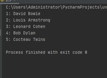 name_list = ['david bowie', 'louis armstrong', 'leonard cohen', 'bob dylan', 'cocteau twins'] n = 1 for name in name_list: print(f'{n}: {name.title()}') n += 1