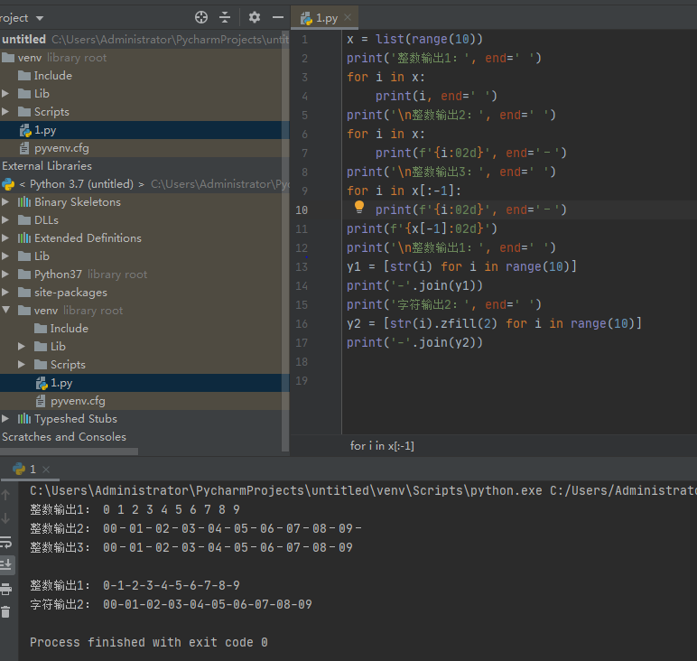 x = list(range(10)) print('整数输出1:', end=' ') for i in x: print(i, end=' ') print('\n整数输出2:', end=' ') for i in x: print(f'{i:02d}', end='-') print('\n整数输出3:', end=' ') for i in x[:-1]: print(f'{i:02d}', end='-') print(f'{x[-1]:02d}') print('\n整数输出1:', end=' ') y1 = [str(i) for i in range(10)] print('-'.join(y1)) print('字符输出2:', end=' ') y2 = [str(i).zfill(2) for i in range(10)] print('-'.join(y2))