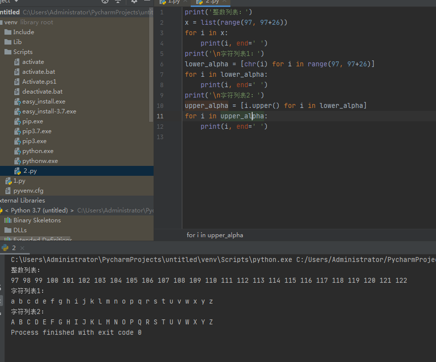 print('整数列表:') x = list(range(97, 97+26)) for i in x: print(i, end=' ') print('\n字符列表1:') lower_alpha = [chr(i) for i in range(97, 97+26)] for i in lower_alpha: print(i, end=' ') print('\n字符列表2:') upper_alpha = [i.upper() for i in lower_alpha] for i in upper_alpha: print(i, end=' ')