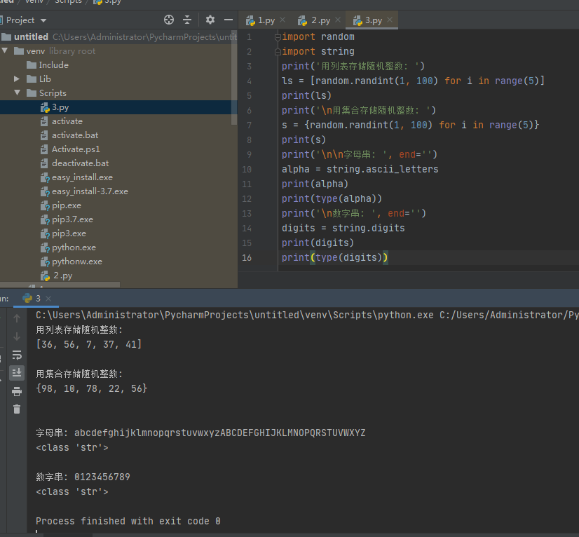 import random import string print('用列表存储随机整数: ') ls = [random.randint(1, 100) for i in range(5)] print(ls) print('\n用集合存储随机整数: ') s = {random.randint(1, 100) for i in range(5)} print(s) print('\n\n字母串: ', end='') alpha = string.ascii_letters print(alpha) print(type(alpha)) print('\n数字串: ', end='') digits = string.digits print(digits) print(type(digits))