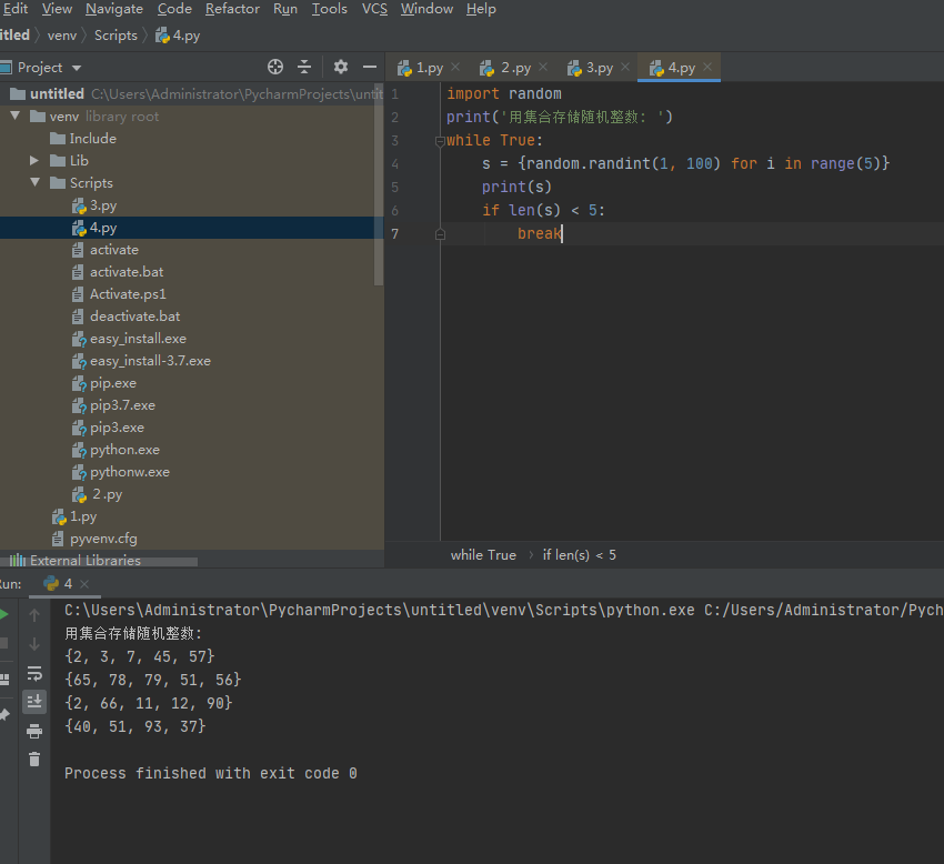 import random print('用集合存储随机整数: ') while True: s = {random.randint(1, 100) for i in range(5)} print(s) if len(s) < 5: break