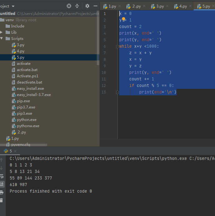 x = 0 y = 1 count = 2 print(x, end=' ') print(y, end=' ') while x+y <1000: z = x + y x = y y = z print(y, end=' ') count += 1 if count % 5 == 0: print(end='\n')