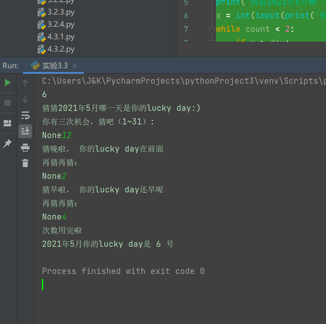 import random day = random.randint(1, 31) print(day) count = 0 print('猜猜2021年5月哪一天是你的lucky day:)') x = int(input(print('你有三次机会,猜吧(1~31): '))) while count < 2: if x > day: print('猜晚啦, 你的lucky day在前面') x = int(input(print('再猜再猜:'))) count += 1 elif x < day: print('猜早啦, 你的lucky day还早呢') x = int(input(print('再猜再猜:'))) count += 1 elif x == day: print('猜对啦') break else: print('次数用完啦') print('2021年5月你的lucky day是', day, '号')
