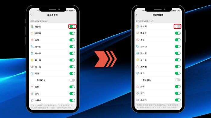 https://new.qq.com/rain/a/20220527A08A6700#:~:text=%E7%AC%AC1%E6%AD%A5%EF%BC%9A%E6%89%93%E5%BC%80%E4%BD%A0%E7%9A%84%E6%89%8B%E6%9C%BA%E5%BE%AE%E4%BF%A1%E5%90%8E%EF%BC%8C%E5%9C%A8%E4%B8%AA%E4%BA%BA%E4%B8%AD%E5%BF%83%E6%89%93%E5%BC%80%E2%80%9C%E8%AE%BE%E7%BD%AE%E2%80%9D%EF%BC%9B,%E7%AC%AC2%E6%AD%A5%EF%BC%9A%E6%89%BE%E5%88%B0%E5%B9%B6%E9%80%89%E6%8B%A9%E2%80%9C%E9%80%9A%E7%94%A8%E2%80%9D%E9%80%89%E9%A1%B9%EF%BC%8C%E9%9A%8F%E5%90%8E%E8%BF%9B%E5%85%A5%E2%80%9C%E5%8F%91%E7%8E%B0%E9%A1%B5%E7%AE%A1%E7%90%86%E2%80%9D%EF%BC%9B%20%E7%AC%AC3%E6%AD%A5%EF%BC%9A%E5%8F%AF%E4%BB%A5%E7%9C%8B%E5%88%B0%E8%BF%99%E4%B8%80%E5%9D%97%E5%9C%B0%E6%96%B9%E9%83%BD%E6%98%AF%E6%98%BE%E7%A4%BA%E5%9C%A8%E5%8F%91%E7%8E%B0%E9%A1%B5%E7%9A%84%E5%8A%9F%E8%83%BD%EF%BC%8C%E6%9C%8B%E5%8F%8B%E5%9C%88%E8%BF%99%E9%87%8C%E4%B9%9F%E6%98%AF%E5%BC%80%E5%90%AF%E7%9A%84%EF%BC%8C%E6%88%91%E4%BB%AC%E5%8F%AA%E9%9C%80%E8%A6%81%E5%B0%86%E5%85%B6%E6%8C%89%E9%92%AE%E5%85%B3%E9%97%AD%EF%BC%8C%E5%8D%B3%E5%8F%AF%E6%88%90%E5%8A%9F%E5%85%B3%E9%97%AD%E4%BD%A0%E7%9A%84%E5%BE%AE%E4%BF%A1%E6%9C%8B%E5%8F%8B%E5%9C%88%EF%BC%81
