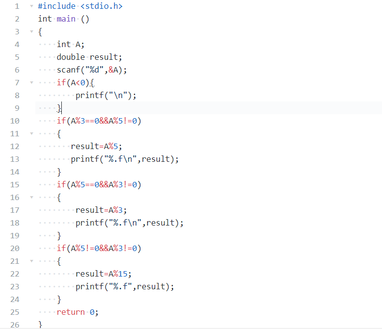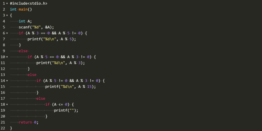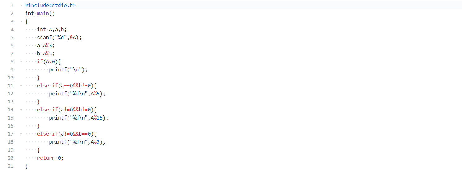 键盘输入1个正的整数A,如果A是3的倍数但不是5的倍数,则输出A除以5的余数。如果A是5的倍数但是不是3的倍数,则输出A除以3的余数。如果A既不是5的倍数但也不是3的倍数,输出A除以15的余数