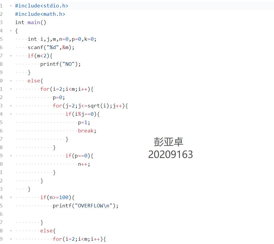 题目内容描述:输入整数m,将所有大于1小于整数m的素数存入所指定的数组中(数组最多只存放100个素数,超过则提示“OVERFLOW”),输出各素数——若输入的m≤2,则提示“NO”,程序终止。注:素数(Prime Number),亦称质数,指在一个大于1的自然数中,除了1和此整数自身外,没法被其他自然数整除的数。