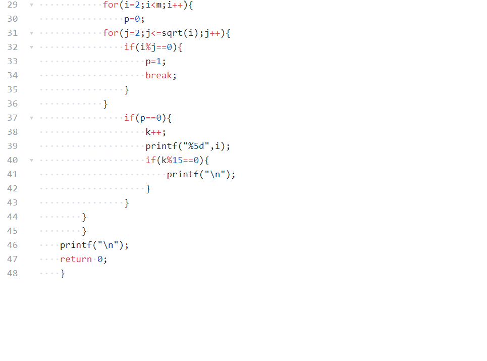 数据表达:用了变量i,j,m,n,p,k,变量i为小于输入值m大于0的数;j为小于i大于0的数,m为输入值,n计算素数个数,p判断素数,k用来控制行数,类型都是整型。