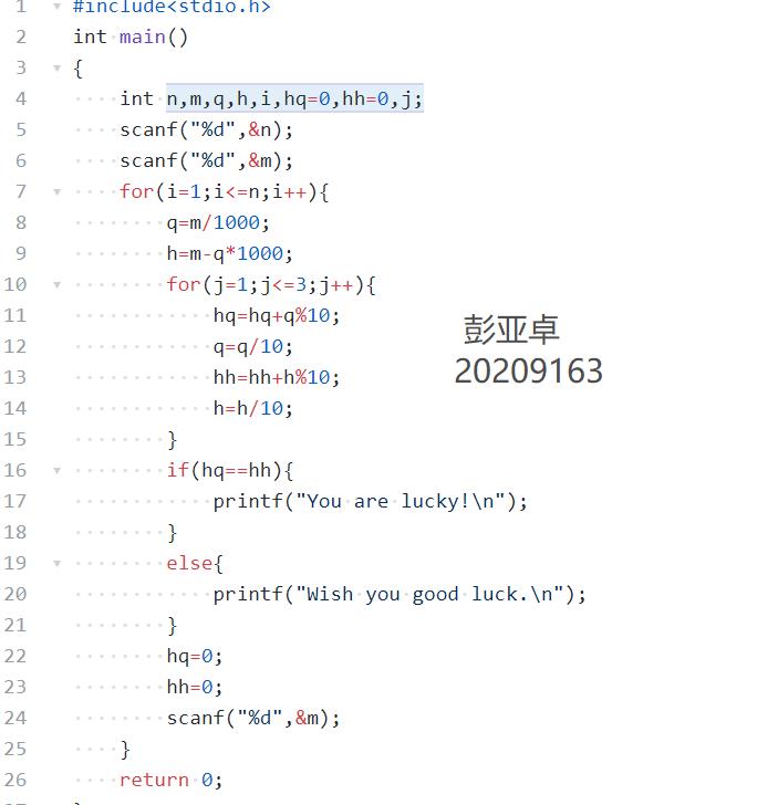 数据表达:用了变量n,m,q,h,i,hq=0,hh=0,j;n为输入彩票数个数,m为彩票数,q为前三位,h为后三位,hp为前三位和,hh为后三位和;