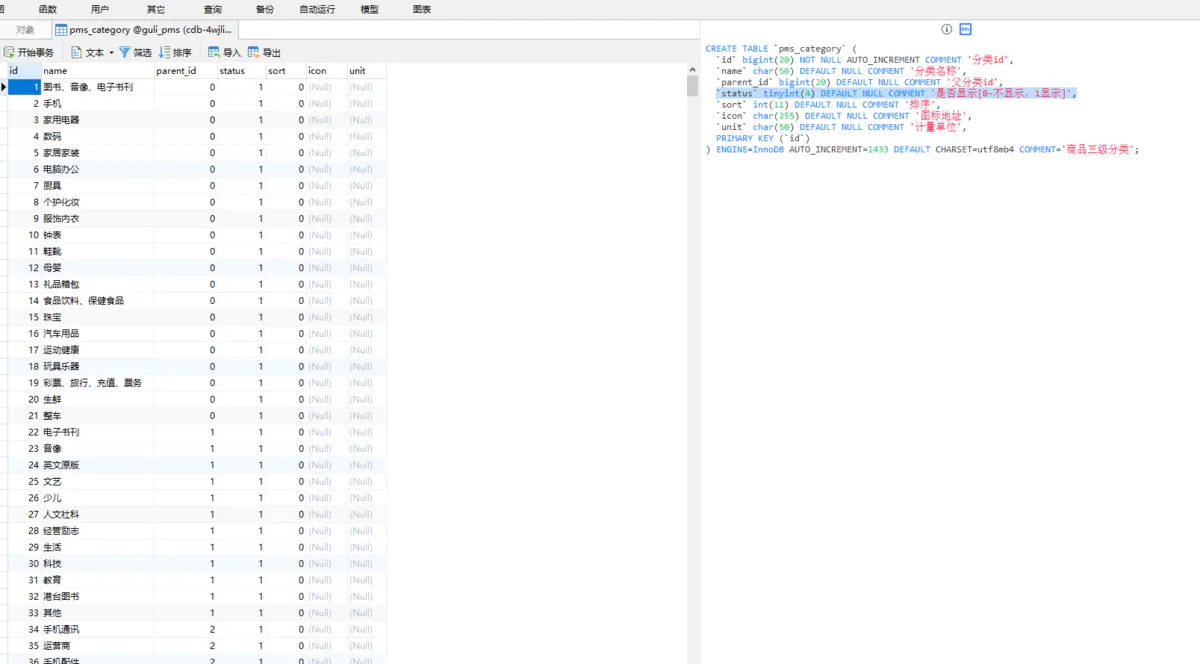 `status` tinyint(4) DEFAULT NULL COMMENT '是否显示[0-不显示,1显示]',