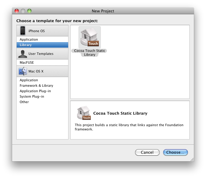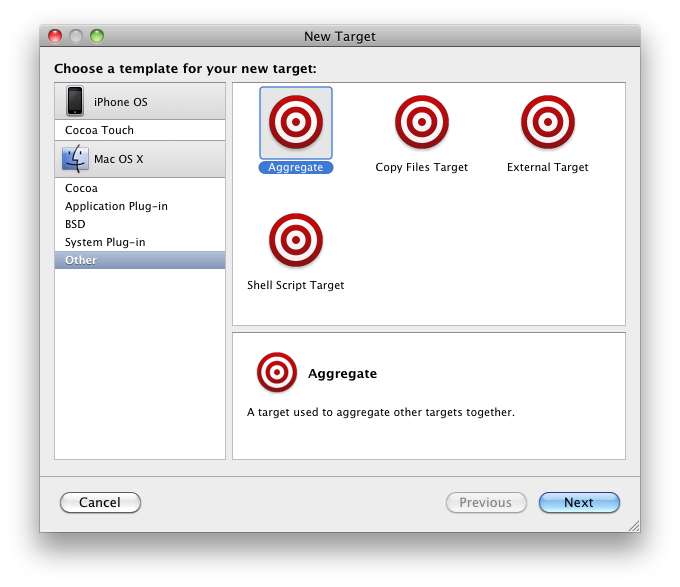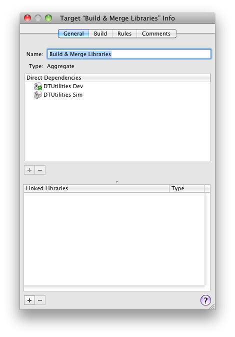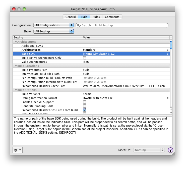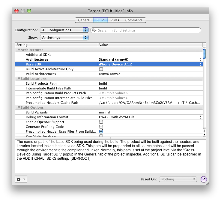 Your default Cocoa Touch static library comes with a single target. We want to be able to build for multiple targets with different architectures. So first we change the current target’s base SDK to iPhone SDK 3.0. This will build it for the arm6 and arm7 platforms. Rename the target by appending Dev to the target name so that we know this is the one set up for device.