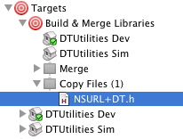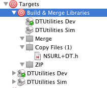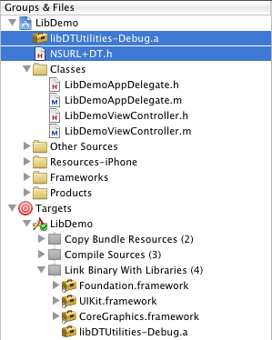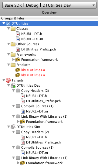 It’s no problem that they have the same output file name because due to the different SDK they end up in different subfolders of your build folder, Debug-iphonesimulator and Debug-iphoneos. If you like you can get them renamed by changing the product name of the targets, but that’s optional. The following shows the layout of your project after all setup but before the builds as the products are still red.