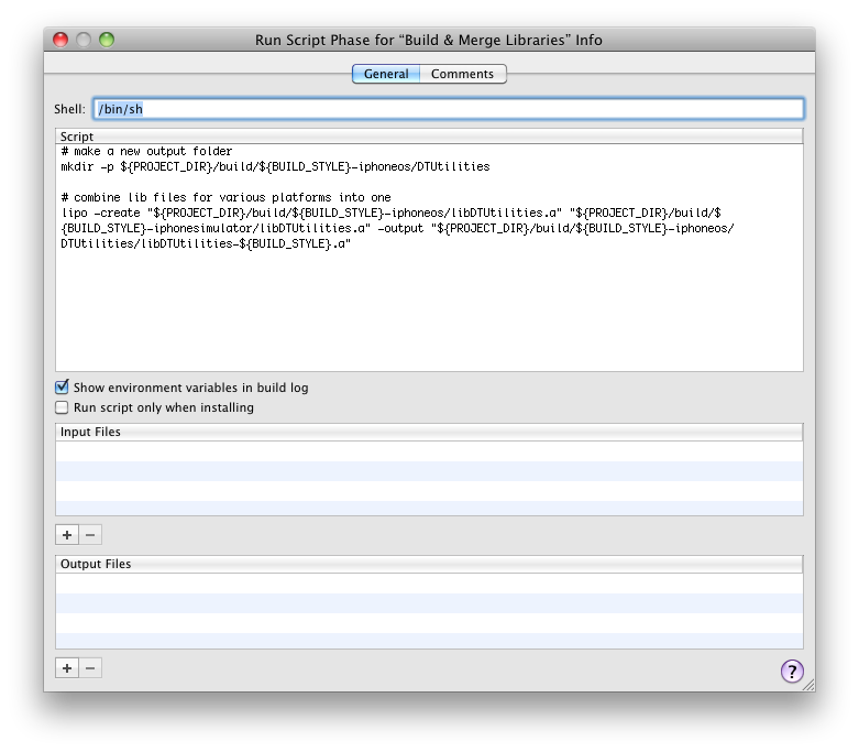 # make a new output folder mkdir -p ${PROJECT_DIR}/build/${BUILD_STYLE}-iphoneos/DTUtilities # combine lib files for various platforms into one lipo -create "${PROJECT_DIR}/build/${BUILD_STYLE}-iphoneos/libDTUtilities.a" "${PROJECT_DIR}/build/${BUILD_STYLE}-iphonesimulator/libDTUtilities.a" -output "${PROJECT_DIR}/build/${BUILD_STYLE}-iphoneos/DTUtilities/libDTUtilities-${BUILD_STYLE}.a" |