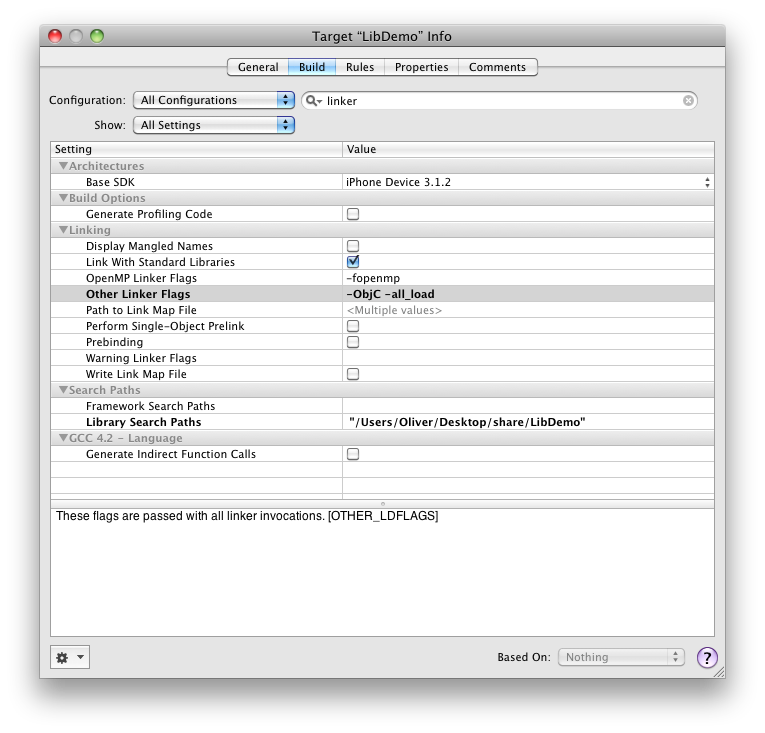The second problem being that NSURL itself is in a different archive than our category extension. It’s in fact in a dynamically bound object file in one of Apple’s frameworks. Thus the linker thinks it’s already got all that makes up NSURL and does not load our category extension. At runtime it turns out that this assumption was false and thus we get the crash. Fortunately we can force inclusion of all our objects from our static library by adding the linker flag -all_load.