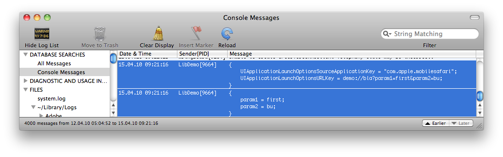 This causes Safari to quit and our app to start. The results from NSLog in simulator also end up in the console app where we can see that all is working. The first NSLog shows the options dictionary, the second the dictionary that our category extension method returned.