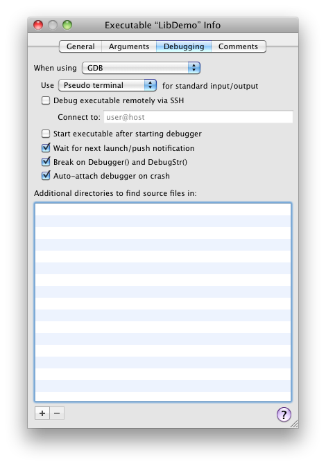 For the LibDemo executable set the debugger settings to “Wait for next launch/push notification”.