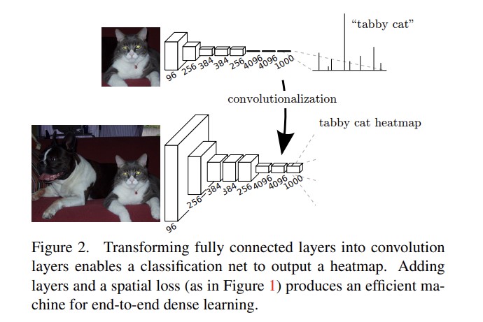 上图通过使用全连接层得到最终的维度为1000的向量,由于全连接层要求的输入大小必须是固定的,因此作者将网络中的全连接层转换为卷积层,输入图像的大小可以是任意的。 那么最后的输出就不是一个一维向量了,就变成了(m,n,c),对应每个channel就是一个2D的数据,可以可视化成一个heatmap图。