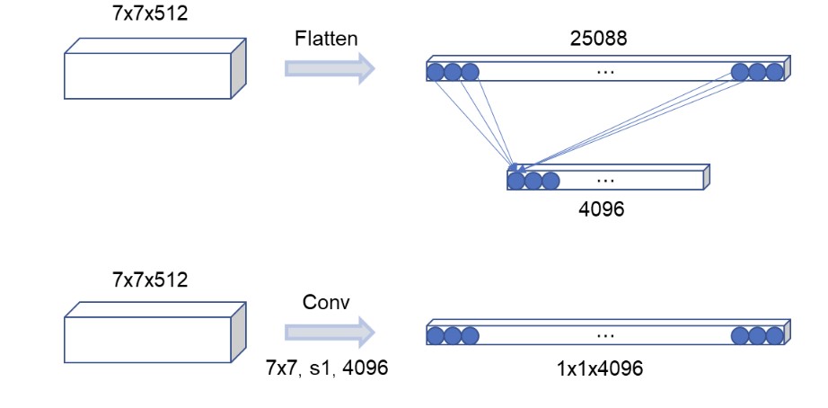 图中将全连接层全部替换成了卷积层,其中全计算量与卷积层的计算量分别为:全连接是25088 × 4096 = 102760448,卷积的计算量是7 × 7 × 512 × 4096 = 102760448,可以看到他们的计算量是一模一样的相当于把全连接的权重进行了reshape操作。
