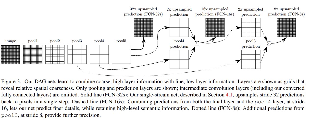 论文中FCN网络有三种模式的模型,分别是FCN-32s,16s,8s,其中数字的含义是将最后得到的特征图通过上采样多少倍后能够恢复到原图尺寸的大小。图中省略了卷积层与其他层级信息,只保留了池化层用于展示多尺度特征融合的过程。