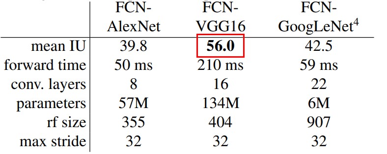由于FCN网络采用的是全类卷积层操作,论文中分别使用Alexnet、VGG16与GoogleNet网络作为backone后用VOC数据集进行微调对比,得到FCN-VGG16的mean IU最高,IU与目标检测模型中的IOU意思一样,用来反映模型预测与框定的效果好坏。