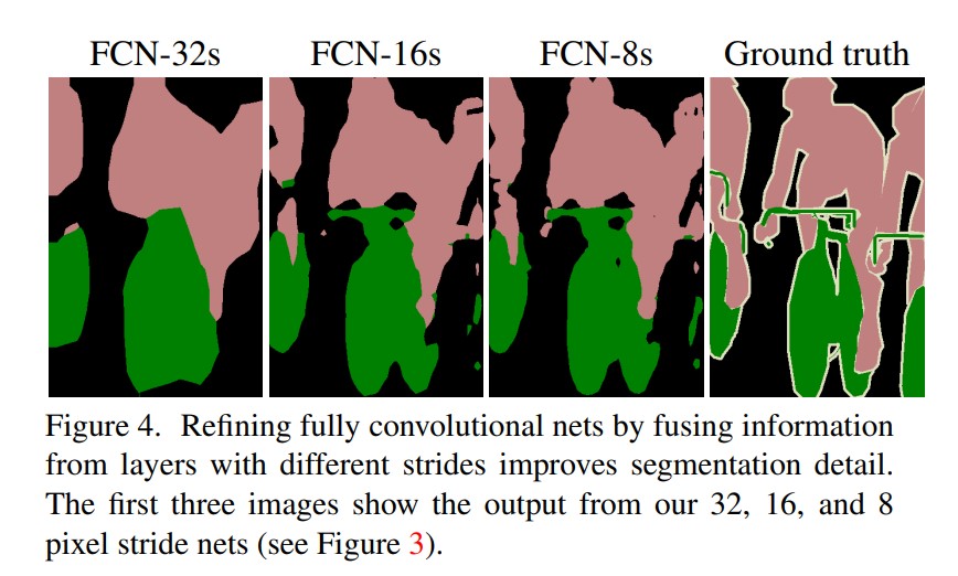 整个网络第一步通过将特征图上采样32倍得到原图大小的输出,此时得到的是FCN-32s模型。然后将该特征图进行2倍的上采样与pool4层的特征图进行结合得到FCN-16s模型,此时的网络能够预测更精细的细节,同时保留高级语义信息。同理,将得到的FCN-16s模型进行2倍的上采样后与pool3的特征图进行融合得到FCN-8s模型,该模型可以得到更加精准的预测。