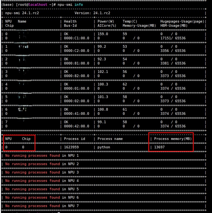 内存使用情况: 整个训练过程的内存使用情况可以通过"npu-smi info"命令在终端查看,因此本文实验只用到了单个npu卡(也就是chip 0),内存占用约13G,对内存、精度或性能优化有兴趣的可以自行尝试进行优化。