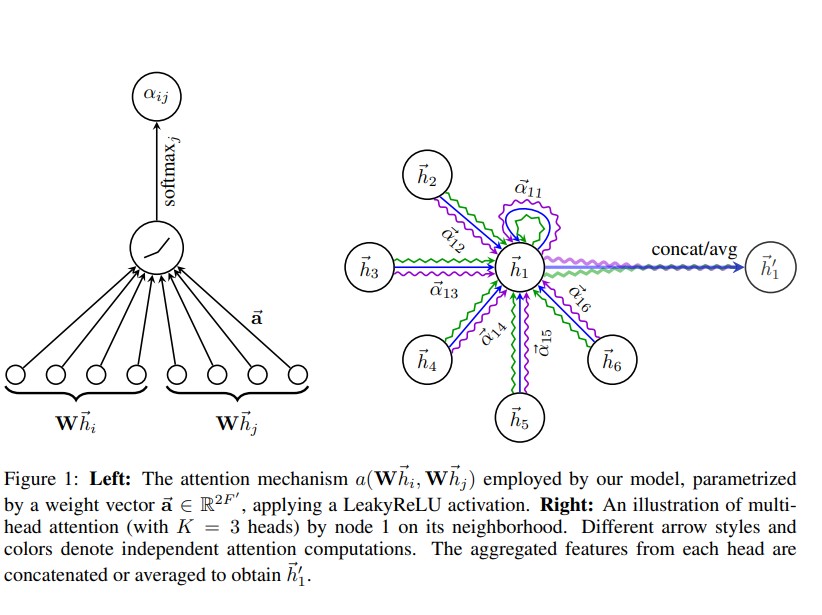 右图表示\(h_1\^′\)在邻域中具有多端连接,不同的箭头样式表示独立的注意力计算,通过直连concat或平均avg获取\(h_1\^′\)。