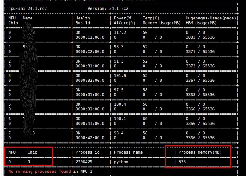 内存使用情况: 整个训练过程的内存使用情况可以通过"npu-smi info"命令在终端查看,因此本文实验只用到了单个npu卡(也就是chip 0),内存占用约573M,对内存、精度或性能优化有兴趣的可以自行尝试进行优化。