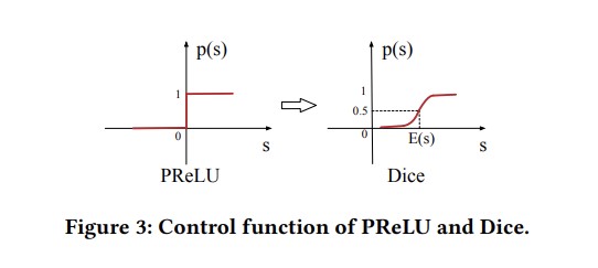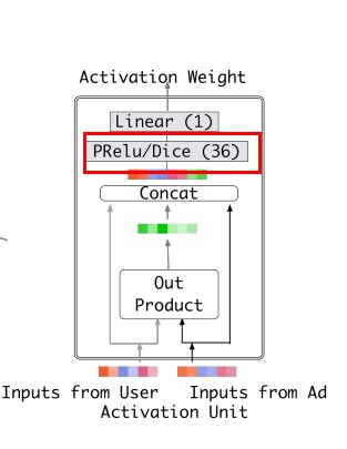 Activation Unit作为Din网络核心模块,通过将用户历史点击过的商品Id(Inputs from User)与候选广告商品的Id(Inputs from Ad)通过Out Product的方式计算相关性。计算相关性后通过concat的方式将原始输入与相关性计算后的输入进行shortcut连接载通过激活与线性层进行输出。关于'PRelu'与'Dice'模块也就是Din网络中引入的自适适应的数据激活函数。