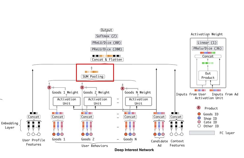 从图中可以看出在做多值特征pooling的时候并不会考虑每个item的重要性,但是在实际的应用过程中我们知道一个爱游泳的人,之前购买书籍、冰淇淋、薯片、游泳镜。给他推荐护目镜后他是否会点击这次推荐广告,跟之前购买的书籍、薯片与冰淇淋无关,而是跟他以前购买的游泳帽相关。也就是在这一次CTR预估中,部分历史数据(游泳镜)起到了决定作用,而其他的基本都无用,所以最好的方式就是给每个item一个权重。