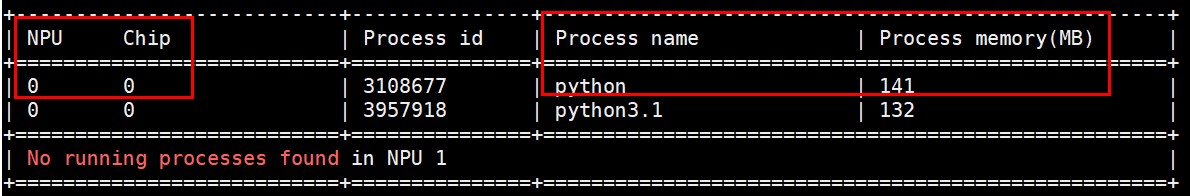 内存使用情况: 整个训练过程的内存使用情况可以通过"npu-smi info"命令在终端查看,因此本文实验只用到了单个npu卡(也就是chip 0),内存占用约141M,对内存、精度或性能优化有兴趣的可以自行尝试进行优化,这里运行过程中也有其他程序在运行,因此本实验用到的网络所需要的内存已单独框出来。