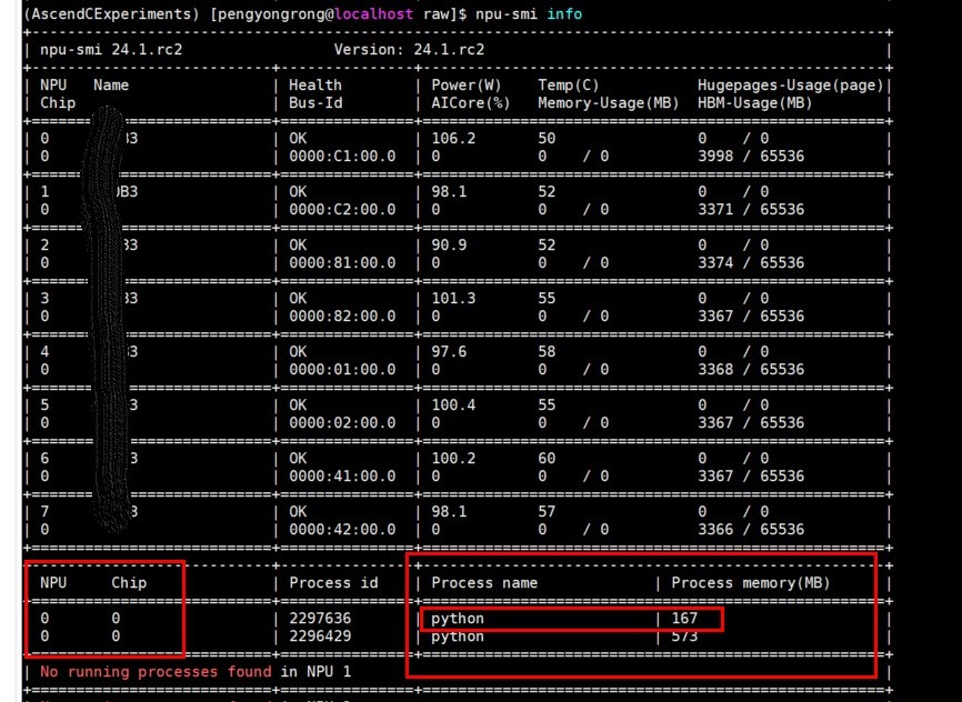 内存使用情况: 整个训练过程的内存使用情况可以通过"npu-smi info"命令在终端查看,因此本文实验只用到了单个npu卡(也就是chip 0),内存占用约167M,对内存、精度或性能优化有兴趣的可以自行尝试进行优化,这里运行过程中也有其他程序在运行,因此本实验用到的网络所需要的内存已单独框出来。